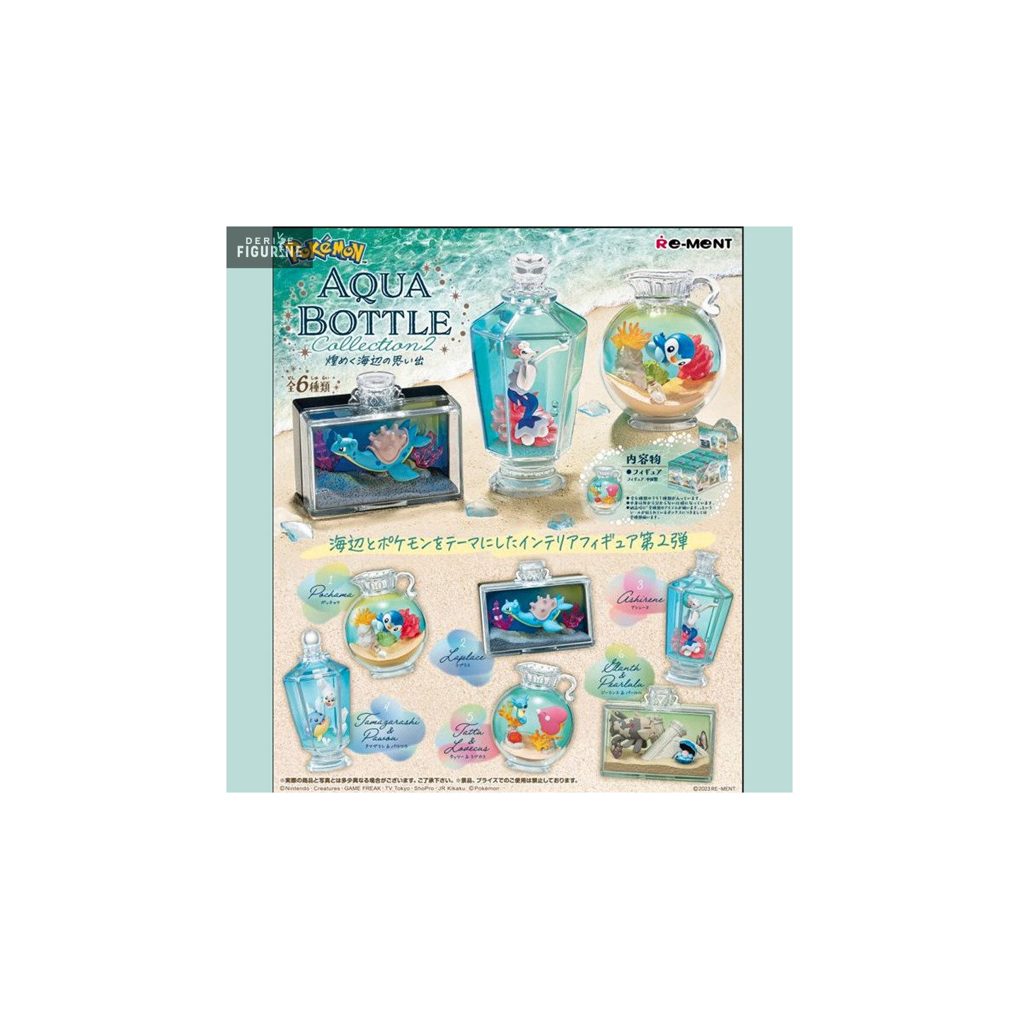 Aqua Bottle Memories of the shimmering seaside collection full pack or random figure features a selection of Pokemon inspired by the shimmering atmosphere of the seaside. Each pack will be complete or you can opt for a random figure may contain one of the following Pokémon: Piplup (Piplup), Lokhlass (Lapras), Oratoria (Primarina), Obalie & Otaria (Spheal & Seel), Hypotrempe & Lovdisc (Horsea & Luvdisc) and Relicanth & Coquiperl (Relicanth & Clamperl). These Aqua Bottle figures evoke the beauty and magic of memories of the sparkling sea and are perfect for Pokemon and ocean lovers.