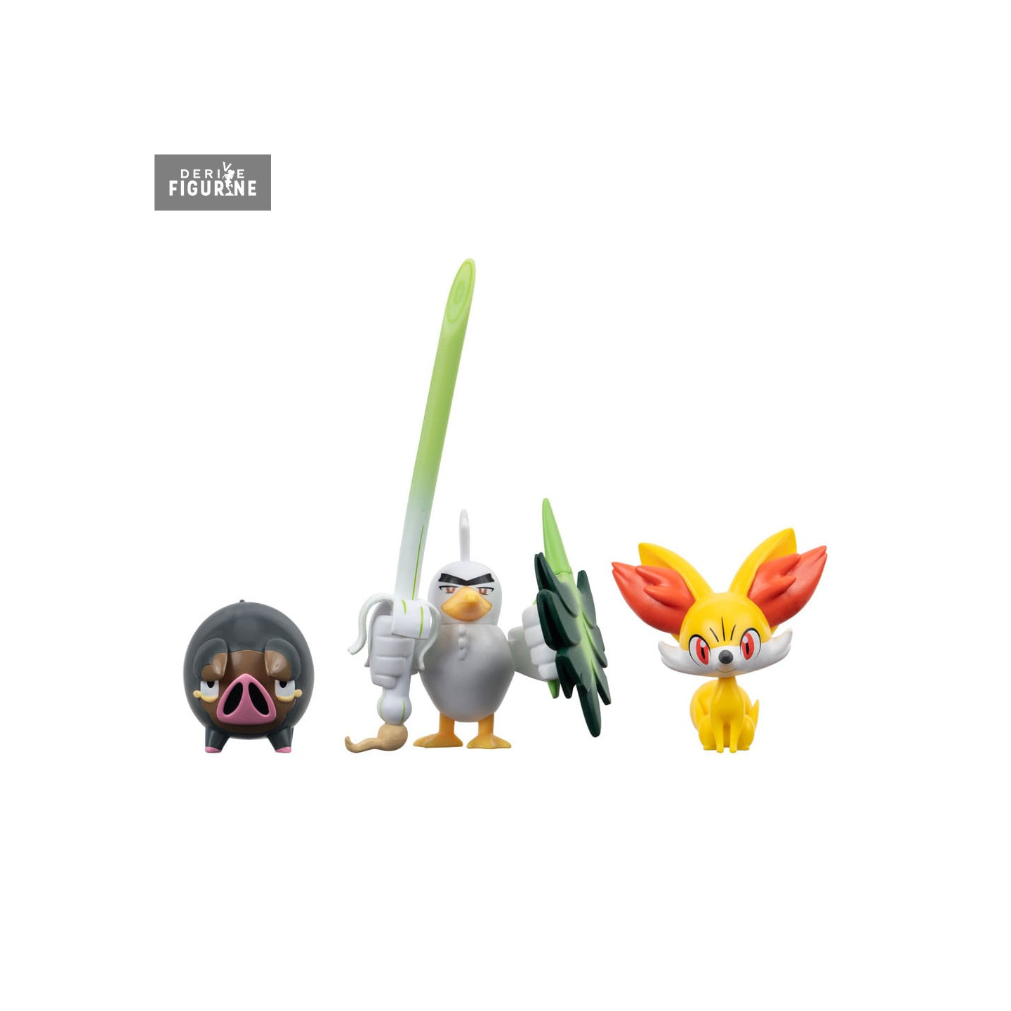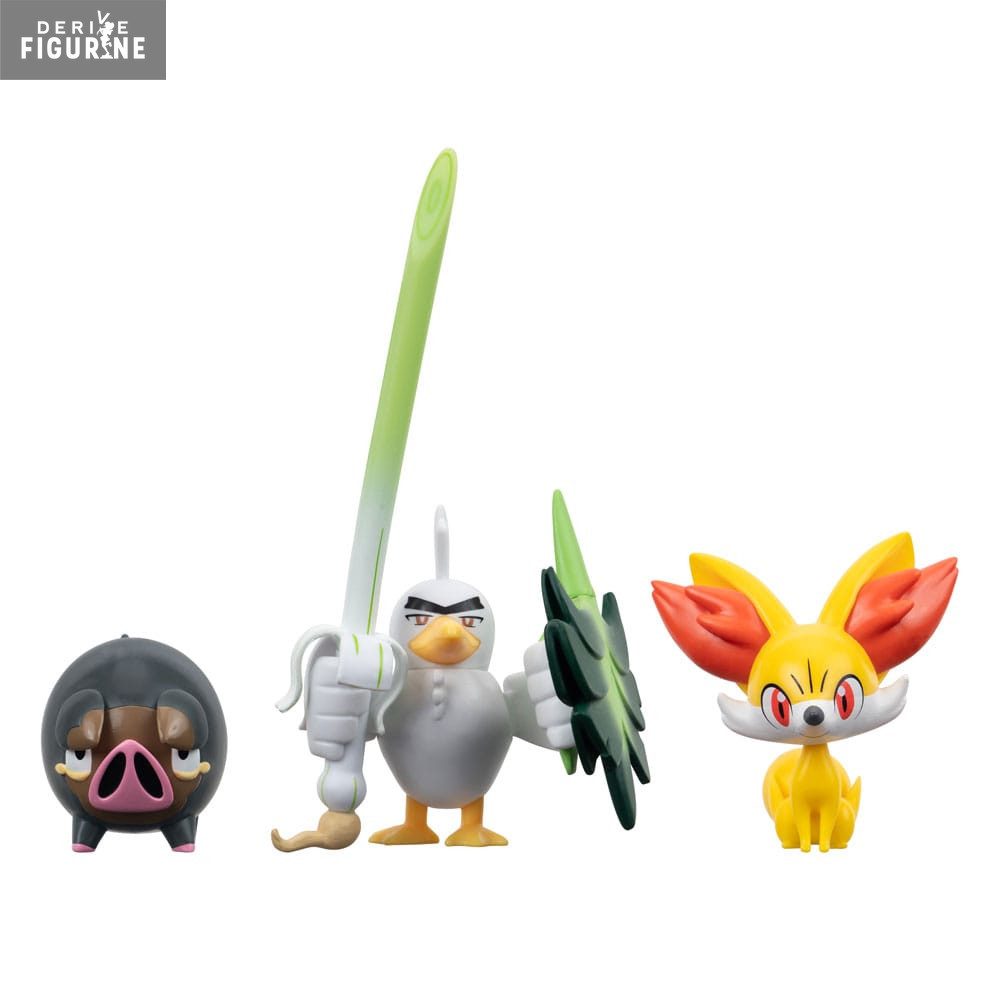 Official figures of Fennekin, Lechonk, Sirfetch'd which measure approximately 5 centimeters high. They are from the Battle Figure collection. The manufacturer is Jazwares.