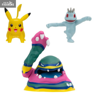 Official figures of Machop, Pikachu Ver.1, Alolan Muk which measure approximately 5 centimeters high. They are from the Battle Figure collection. The manufacturer is Jazwares.