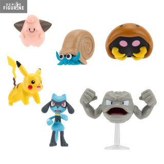 Official figures of Pikachu, Cleffa, Riolu, Geodude, Omanyte and Kabuto which measure approximately 5 centimeters high. They are from the Battle Figure collection. The manufacturer is Jazwares.
