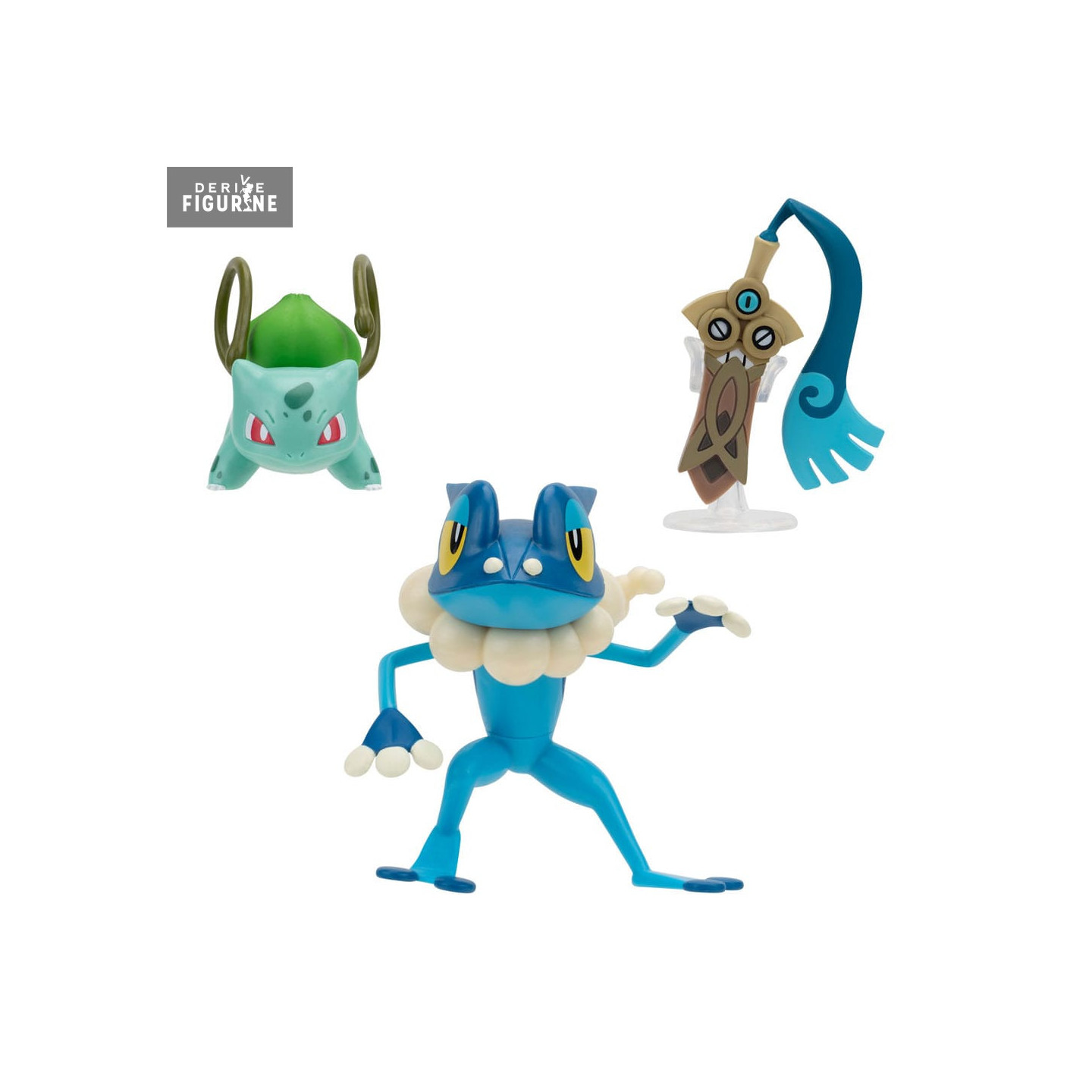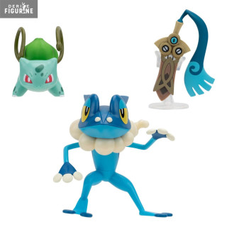 Official figures of Honedge, Bulbasaur ver.4, Frogadier which measure approximately 5 centimeters high. They are from the Battle Figure collection. The manufacturer is Jazwares.