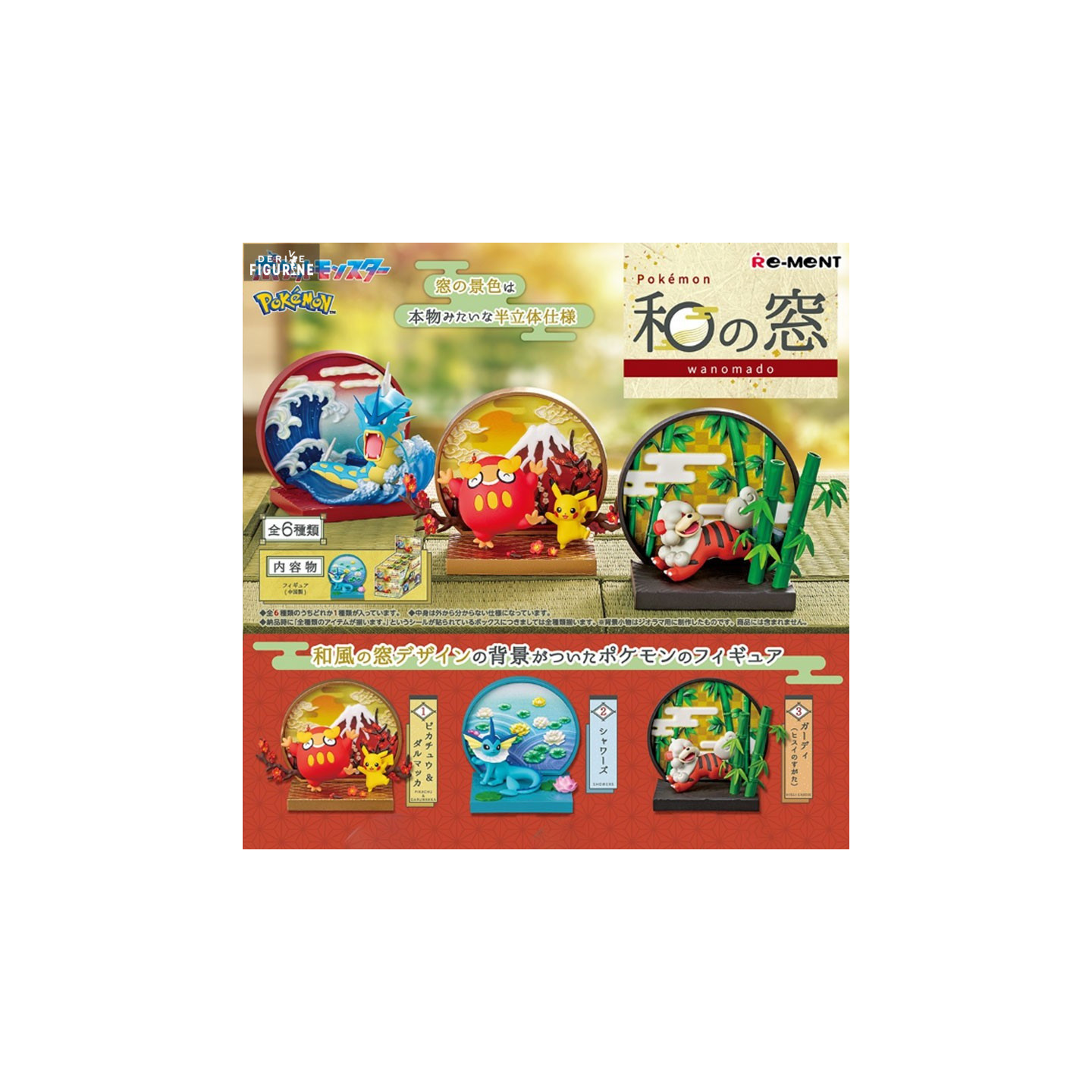 Immerse yourself in the traditional Japanese aesthetic with this stunning collection of Pokémon figurines, Wanomado, crafted by Re-Ment. These figurines beautifully capture the essence of some of the most iconic Pokémon, while embedding them into scenes inspired by Japanese art and culture. Each piece features a Pokémon in harmony with a natural landscape, framed by traditional Japanese windows known as "Wanomado," adding an aesthetic dimension and a touch of serenity to each composition.