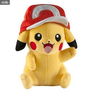 Official plush of Pikachu with Ash's cap which measures about 26 centimeters high. The manufacturer is Tomy.