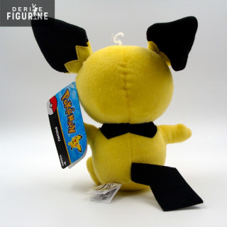 Plush Pokemon representing Pichu. About 25 centimeters. Plush fabric and polyester fiber. The manufacturer is Tomy.