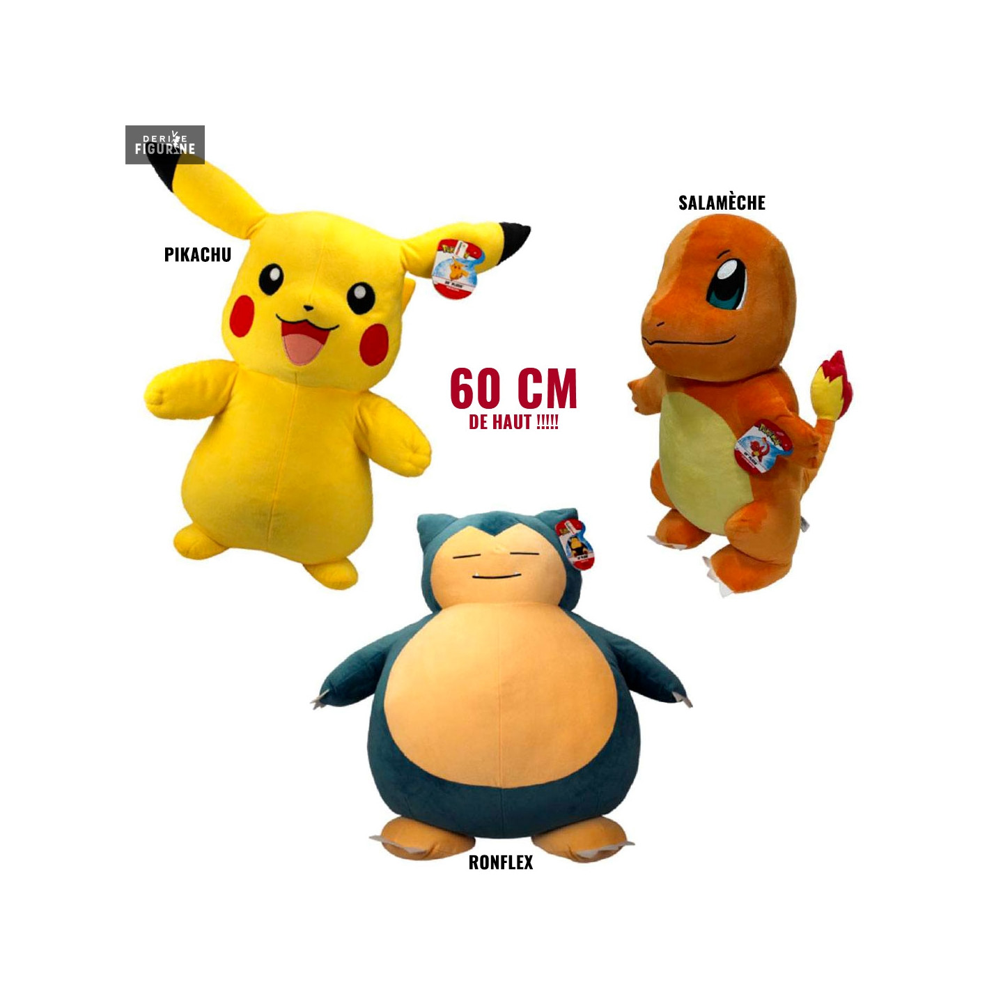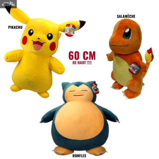 Official plush of your choice between Pikachu, Charmander or Snorlax in 100% polyester which measures about 60 centimeters high. The manufacturer is BOTI.