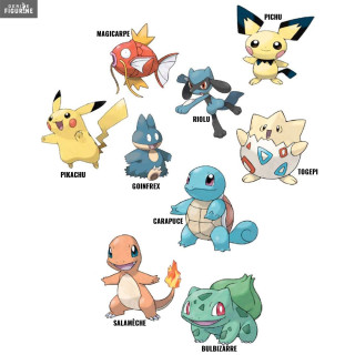 Official plush of your choice between Pikachu, Charmander, Squirtle, Bulbasaur, Pichu, Munchlax, Magikarp, Togepi or Riolu which measures about 20 centimeters high. The manufacturer is BOTI.