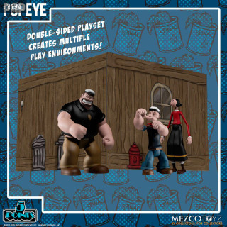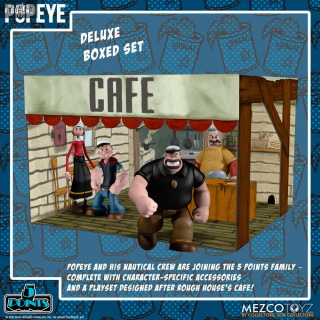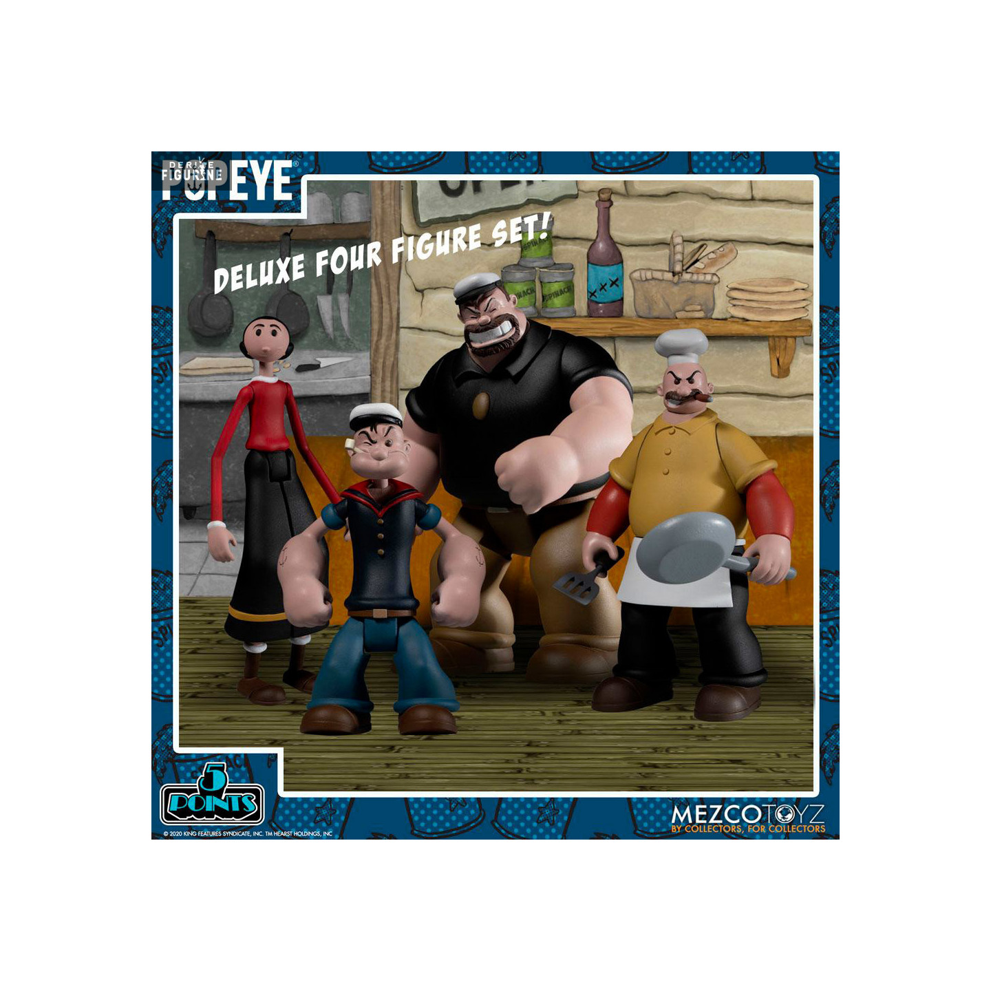 Official figures of Popeye which measure about 9 centimeters high. They are from the 5 Points collection. The manufacturer is Mezco Toys.