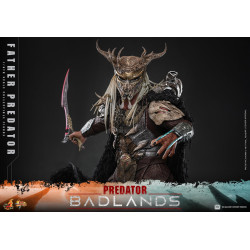 Visually, he’s shown as a bulky, armored Predator with bronze-and-dark plating across the torso, shoulders, and legs, layered for a rugged, battle-ready look. Two head options are pictured: a fierce horned mask with deep sculpted textures, and an unmasked red-toned head with open mandibles, framed by long pale dreadlocks. Chunky forearm gear stands out, along with wrist blades (also shown in a “blood-painted” variant in the image), and multiple interchangeable hands are displayed. For accessories, you can see a long red staff/sword-like weapon and a display base with a “BADLANDS” nameplate. Once it’s set on the base, it reads immediately as a centerpiece on the shelf.