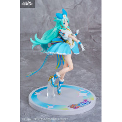 She wears a vivid blue outfit with a layered, puffy skirt, white puffy sleeves, and a multicolored ribbon belt resembling musical staves. Gold and star accents complete the ensemble. Her right foot is supported by a transparent piece, enhancing the light, floating pose.