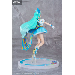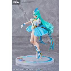 The figure shows her mid-performance, light and graceful, as if caught in motion. Her long turquoise hair sways in two playful twin-tails, topped by a large blue bow. Her bright eyes and confident smile reflect her stage charisma and positive energy.
