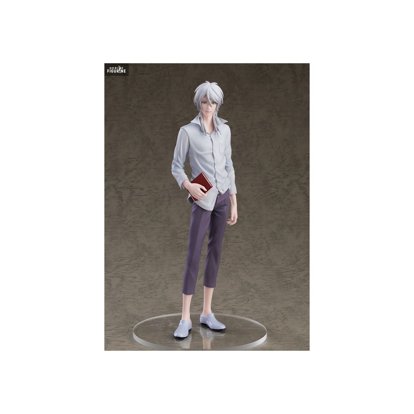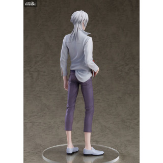 The details on this figure are remarkable, with special attention paid to his casual yet polished outfit. Makishima wears a lightly unbuttoned white shirt, paired with purple pants and stylish gray shoes. Her carefully styled white hair frames her face in a way that accentuates her intense gaze and imposing presence.