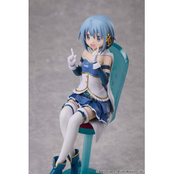 She’s shown sitting on a teal-blue support seat, knees together with her ankles crossed, both hands raised in a double peace sign. Her blue hair is cut short with a small yellow hair clip on the side, and she wears a cheerful open-mouth expression. Her magical girl outfit mixes blue and white with gold trim, a layered blue skirt, dark blue long sleeves, and white gloves. She has white thigh-high tights, and blue boots accented with gold details; the vertical base makes her easy to display without taking up much space.