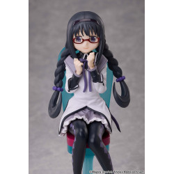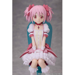 Visually, you get all five characters seated on teal-blue chairs with pink seats, arranged around a round table with a central pedestal. The table is mostly black with a blue-toned top and an openwork pattern, and a small centerpiece sits in the middle with a pink bow on top. Each outfit matches the character’s signature look: Sayaka in blue and white with blue boots, Homura with braided hair and glasses, Madoka in pale pink with twin tails, Mami in yellow and brown with her small hat, and Kyoko in burgundy with a more laid-back pose. It displays nicely as a single focal scene, thanks to the table anchoring the composition.