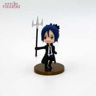 Second hand and official Rokudou Mukuro Gashapon in PVC which measures about 7,5 centimeters high. On a gilded base, the character holds his trident in his right hand and a Vongola box in the other. This is a second hand item in perfect condition. The manufacturer is Takara Tomy A.R.T.S, sold without box.