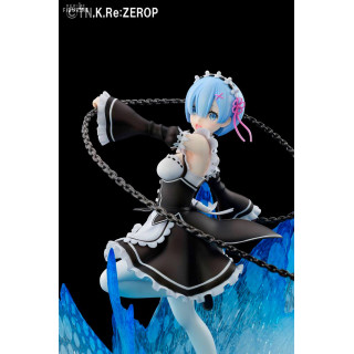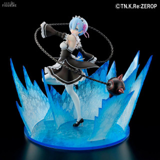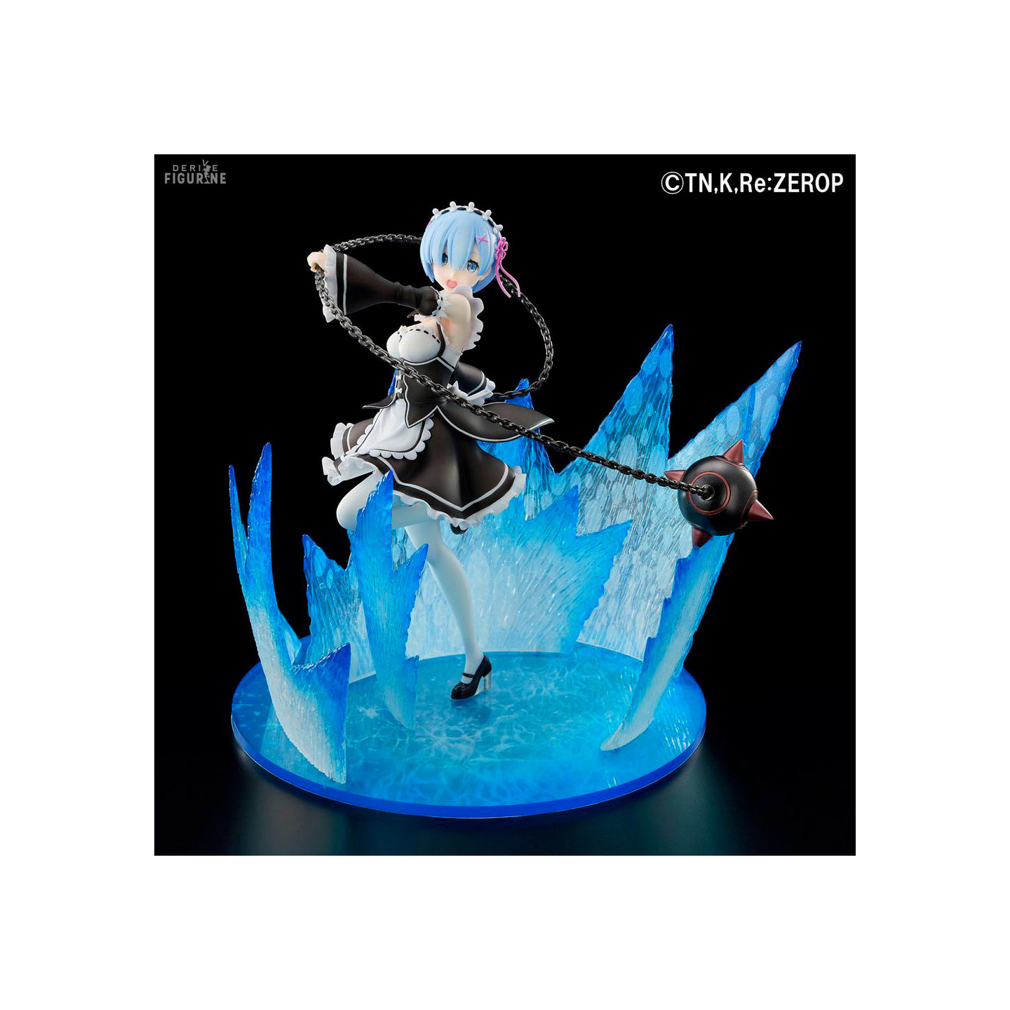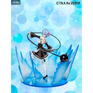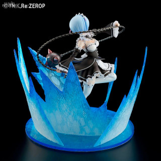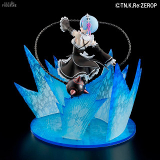 Rem is one of the iconic characters from the Re:Zero anime. We find her here in her original maid outfit in full attack with her favorite weapon, the chain ball. In a motion effect, she looks like she's sending an attack with her cannonball, and her effect-packed base is reminiscent of her most epic battle moments from the anime.