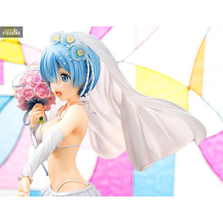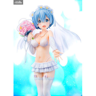 It's not common to get married in such a light outfit, so I imagine the wedding is over and it will give way to the wedding night, but for sure you would have also said yes to the pretty Rem if you saw it like that. She has pearls and blue flowers in her hair, as well as her bouquet of pink flowers in her hand.