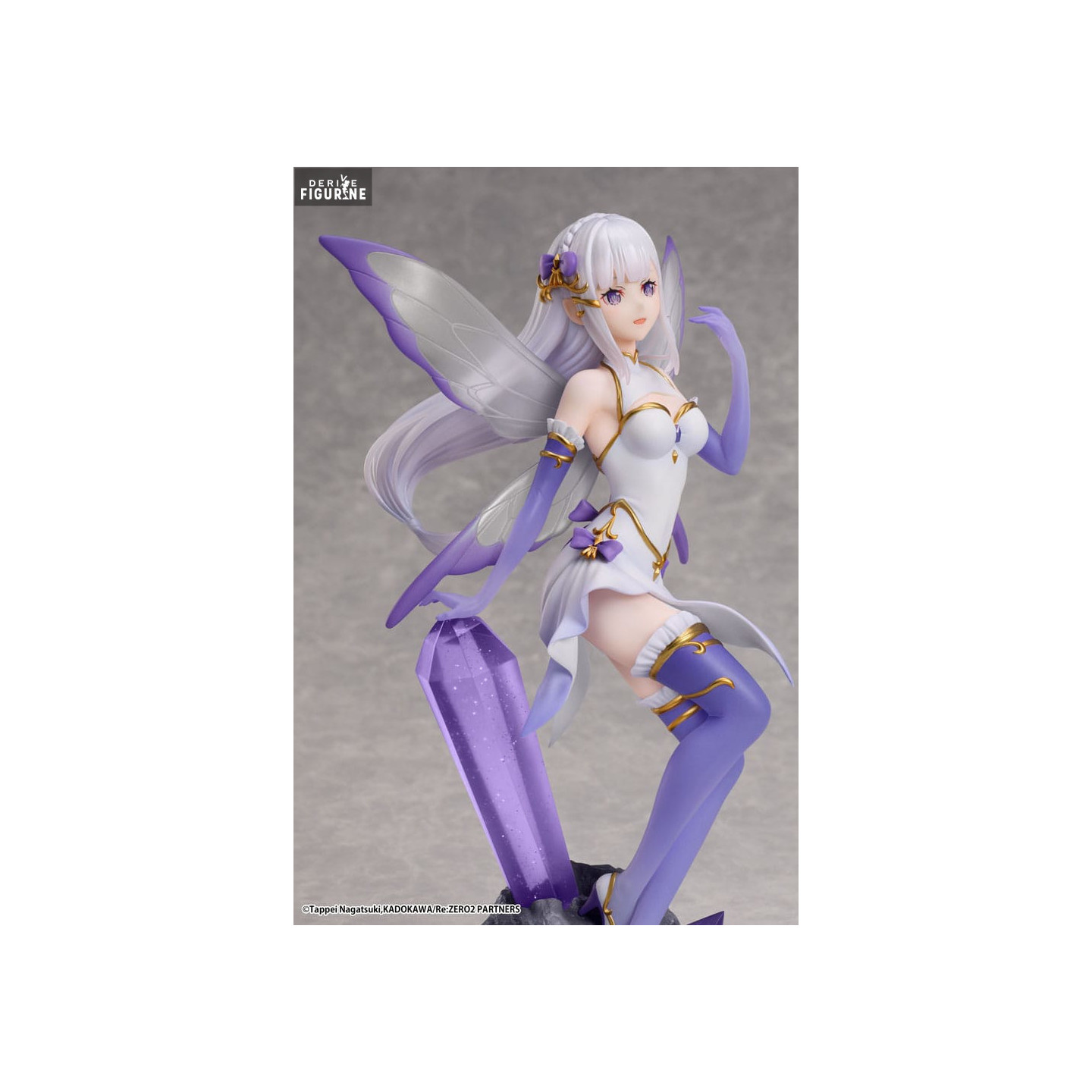 The "Jewel Princess" figurine of Emilia beautifully captures the essence of this beloved character. Standing on a base decorated with violet crystals, Emilia exudes grace with her translucent wings that add a fairy-like touch. Her outfit, inspired by magic and precious gems, is finely detailed, bringing out the intricate aspects of her appearance. The manufacturer Elcoco has meticulously crafted this 24-centimeter, 1/7 scale figure, ensuring that every detail is faithfully reproduced, making it a must-have for collectors and fans alike.