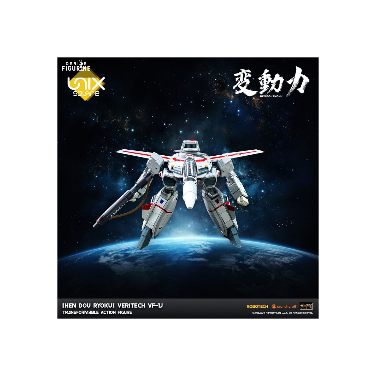 Official figure of VF-1J Veritech in metal which measures approximately 21 centimeters high. It is from the Hen Dou Ryoku collection. The manufacturer is Unix Square.