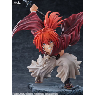 Armed with his sakabatō (reverse-blade sword), Kenshin is depicted mid-action, ready to strike his opponent. His iconic outfit—white hakama and red jacket—is faithfully recreated, with natural folds and flowing motion effects that enhance the scene’s intensity. His piercing gaze and confident smile perfectly convey his warrior spirit, while the rocky-effect base adds realism to the display.