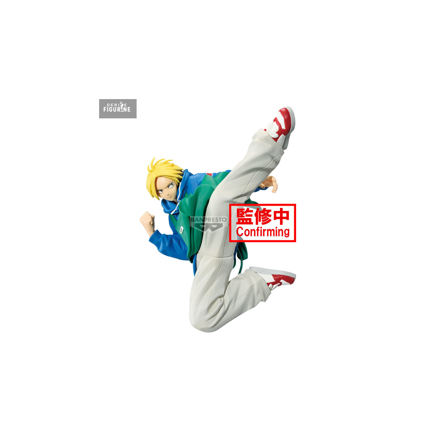 The figure highlights Shin's casual yet practical style, dressed in a blue hoodie with a green jacket over it and loose-fitting pants, true to his appearance in the series. The carefully crafted details of his clothing, such as the fabric folds and material textures, add a layer of realism to this representation. His blonde hair is precisely sculpted, capturing the movement and dynamism of the scene.