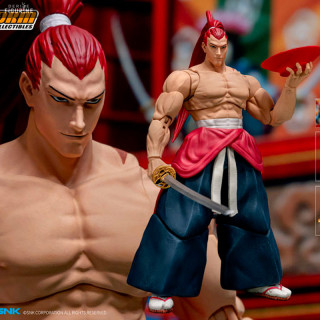 Genjuro Kibagami is a character that you can find in several Samurai Shodown games, and he is Haohmaru's rival. He is imposing because he is very muscular and is over six feet tall. He is not afraid to fight, and even takes pleasure in hurting his enemies, sometimes going so far as to make a business out of it. Here you can see him unleash his most powerful attacks thanks to the interchangeable accessories and parts.