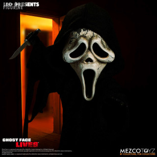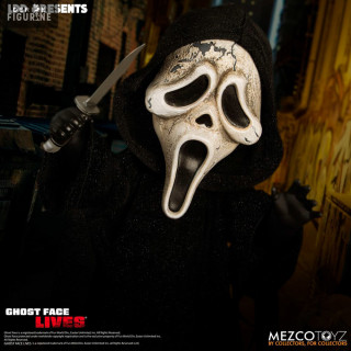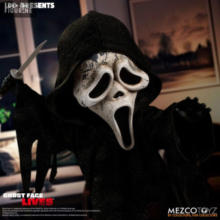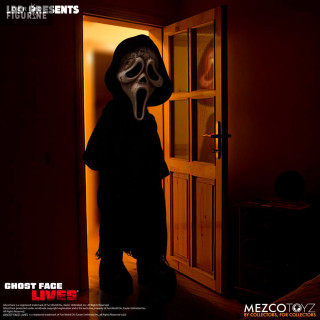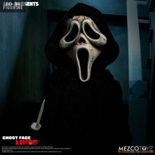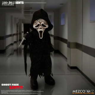 Official doll of Ghostface with fabric clothes measuring about 25 centimeters high. It is from the Living Dead Dolls collection. The manufacturer is Mezco Toys.
