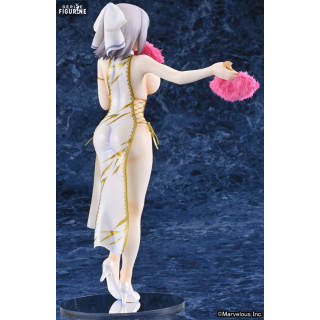 The Yumi figurine, in its "Special Holidays" version, shows her dressed in a sensual and festive holiday outfit. She wears a white dress delicately decorated with gilding and lacing, revealing her elegant figure and highlighting her seductive appearance. The pink pom poms she is holding add a playful and festive touch, contrasting perfectly with her sophisticated outfit.