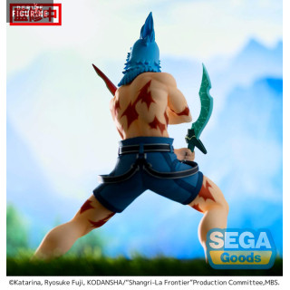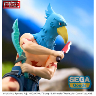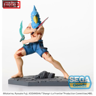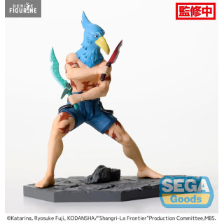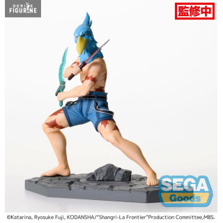 The Sunraku figurine from the Luminasta collection is a superb model representing the main character of "Shangri-La Frontier." This figure perfectly captures the appearance of Sunraku, a slim teenager with blue hair and blue eyes. In the game, Sunraku wears a unique avatar, and the figure reflects this accurately. He is depicted as a half-naked, athletic young man, wearing blue shorts with a matching belt. His look is completed by his iconic helmet in the shape of a blue bird with a yellow beak, which covers his face. The figure is also true to character detail, including the Mark of Lycaon, the cursed scar that appears on his torso and leg after his defeat by Lycaon. This mark requires him to perform half-naked, which adds a unique element to his design. For "Shangri-La Frontier" and Sunraku fans, this collectible figure is a must-have to display this iconic character in all his glory in your collection.