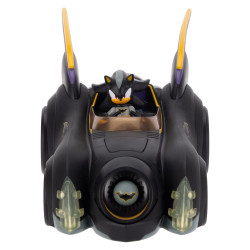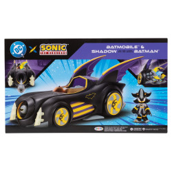 When DC crosses paths with Sonic the Hedgehog, the concept is straightforward: bring together two instantly recognizable worlds, one built on masked vigilantes, the other driven by high-speed heroes and arcade energy. In this mash-up, Shadow shows up as Batman, blending his naturally darker aura with the silhouette and symbols of the Dark Knight. This official Shadow Batman & Batmobile set, manufactured by Jakks Pacific, pairs the Batmobile with a Shadow figure in this themed version.
