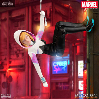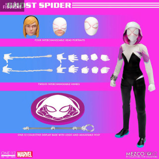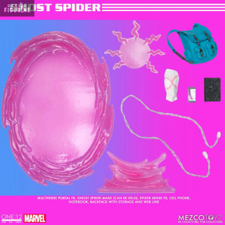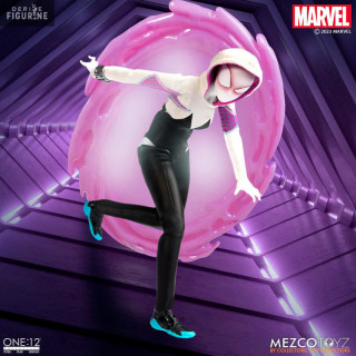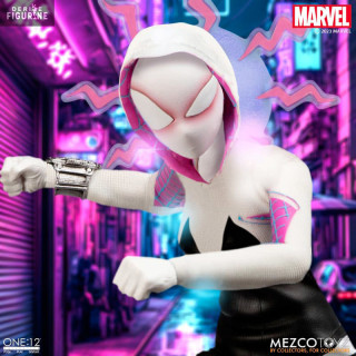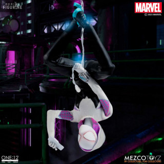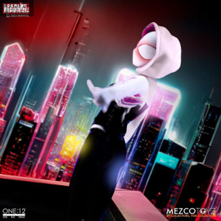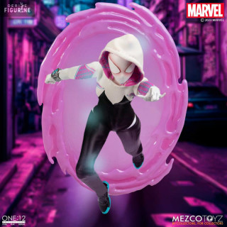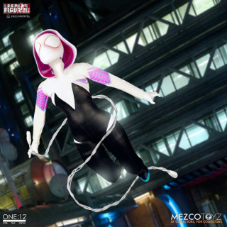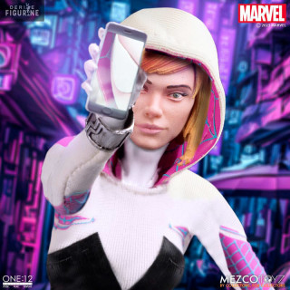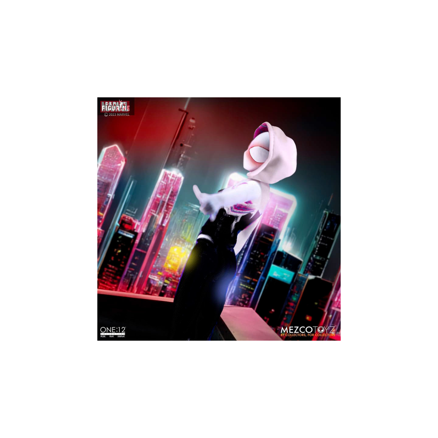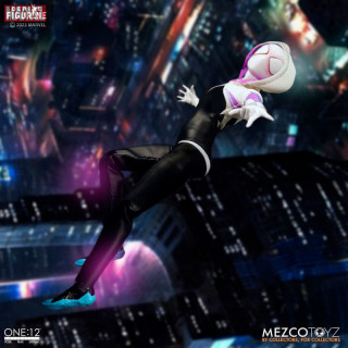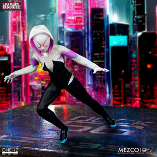 Official figure of Ghost-Spider in PVC which measures approximately 16 centimeters high, scale 1/12. It is from the One:12 collection. The manufacturer is Mezco Toys.