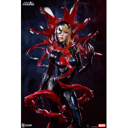 Her glossy black suit contrasts sharply with the vivid red of the symbiote, sculpted with precision to highlight its organic, invasive nature. Every tentacle and movement frozen in resin radiates tension and aggression. The asymmetric face and wind-swept hair add even more drama to the piece.