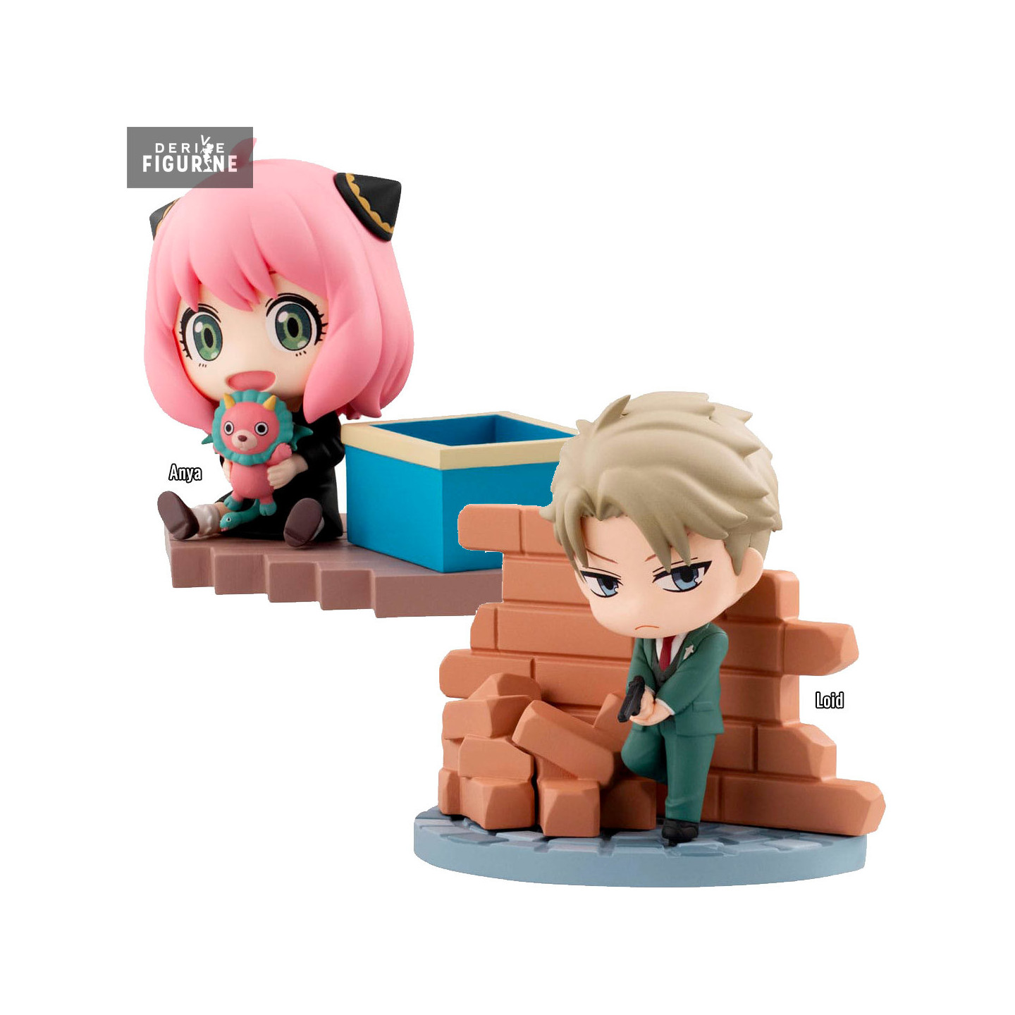 The Hold collection features a fun and quirky take on characters from the Spy x Family anime. This time, you have the choice between two miniatures: Anya Forger or Loid Forger. In the figure featuring Loid Forger, we see him in stealth mode, hiding behind a broken wall with his gun in hand. This chibi design adds a comical twist to Loid's generally serious and competent appearance, reflecting his role as a master spy. On the other hand, the Anya Forger figurine captures the softness of her personality. Sitting next to a blue box, she holds a plush toy of the director chimera in her hands. This detail is a nod to the anime universe, where the chimera plush is a recurring and iconic element. The Hold Collection offers a charming way to showcase Spy x Family characters in playful chibi style, bringing a whole new dimension to your collection.