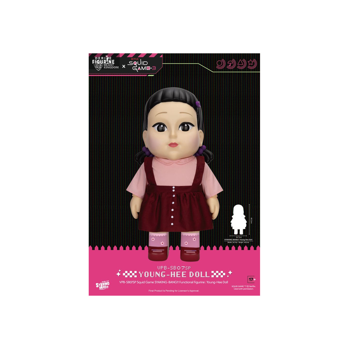 Step into the chilling world of Squid Game 3 with this official Young-Hee Doll piggy bank from Beast Kingdom’s Syaking Bang collection. Standing approximately 48 cm tall, this PVC replica captures every detail of the giant doll from the series: her burgundy pinafore dress, pale pink shirt, patterned socks, and braided hair framing an innocent face with piercing black eyes.