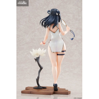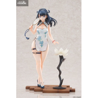 This figure captures her unique style, dressed in a stunning white Chinese dress adorned with blue floral patterns. The intricate details of the outfit, from the delicate embroidery to accessories like her fan, emphasize her natural grace and add a touch of sophistication to her appearance. She also wears a faux fur stole, further enhancing her refined look. Additionally, the wooden base and sculpted flower beside her create a harmonious and aesthetic setting for this collectible piece.