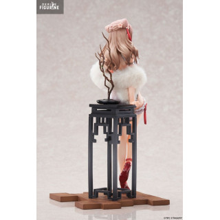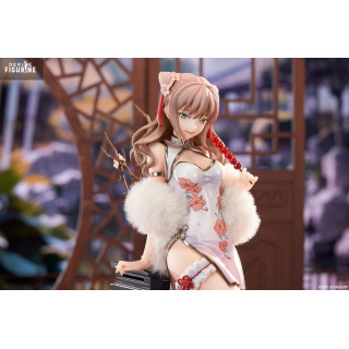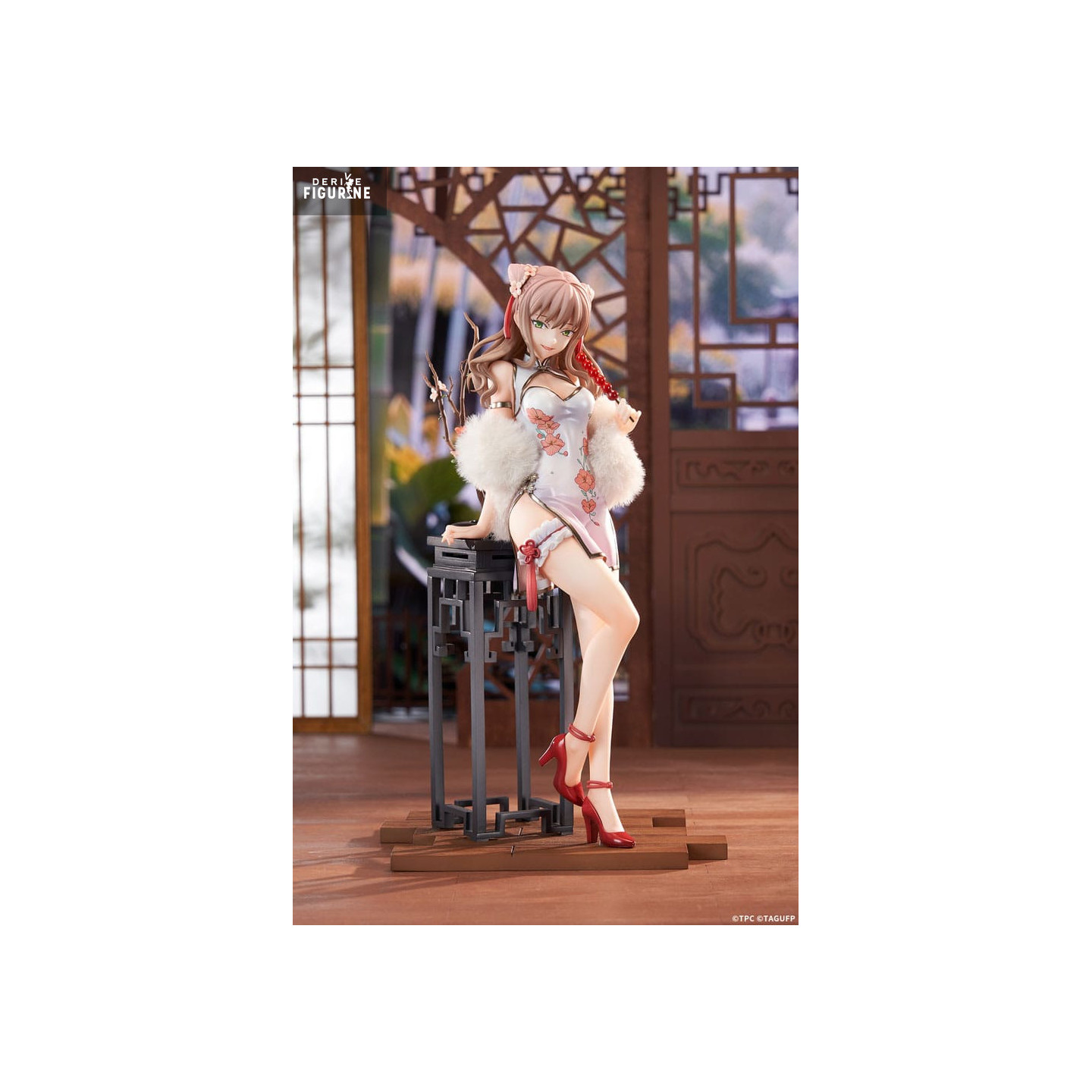 This figure perfectly captures her elegance and natural grace. Dressed in a white Chinese dress adorned with red floral patterns, Yume is seated with a seductive pose and a slight smile, radiating both confidence and mystery. The intricate details of her outfit, such as the delicate embroidery and faux fur stole, add a touch of refinement, while her red high heels enhance her sophisticated appearance. The scene is completed with a decorative black wooden structure that highlights her charm and relaxed posture.
