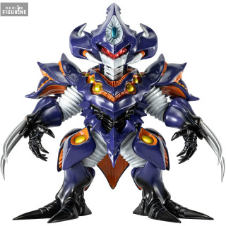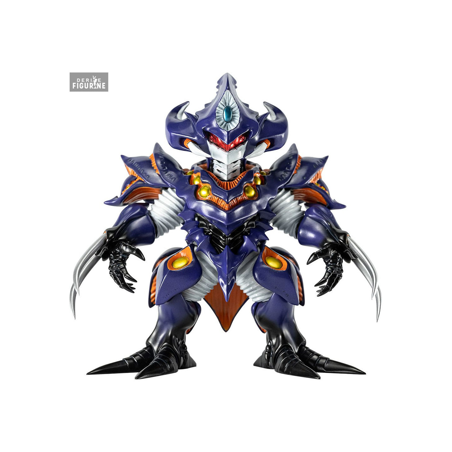 The figure’s design faithfully echoes the animated model: deep purple armor accented with golden rings across the chest and scaly membranes highlight its monstrous aspect. Curved joints reveal silver metallic folds, while its helmet, adorned with a single blue eye, presents a menacing gaze. Every scratch and spike is rendered with exceptional precision.