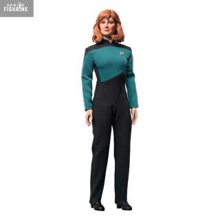 The Dr. Beverly Crusher figure, from the Essential Edition and produced by EXO-6, stands approximately 27 centimeters tall at a 1/6 scale. This highly detailed figure perfectly captures the appearance and presence of the character, with great attention to detail. Beverly is dressed in her Starfleet medical uniform in teal and black, featuring the distinctive Starfleet insignia. Her face is finely sculpted to reflect the calm and determined expression she often wears in the series.