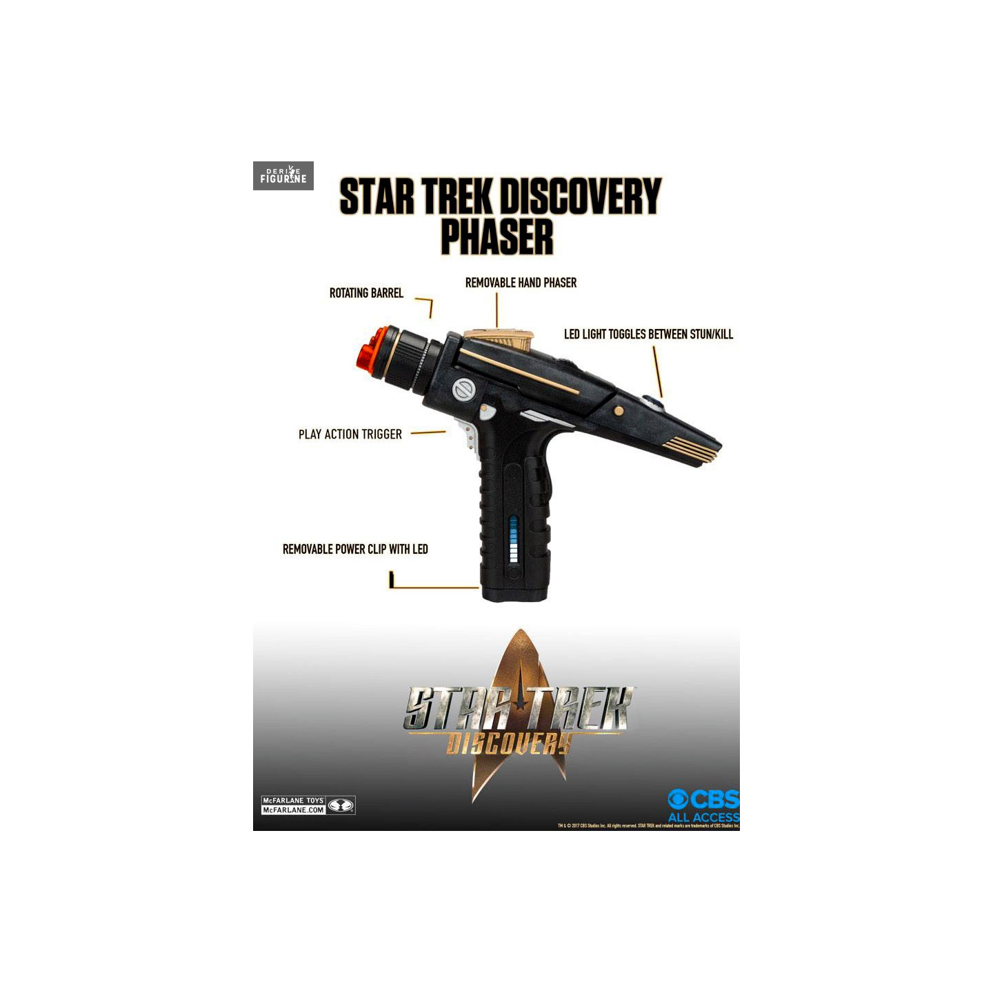 Official Phaser replica wich measure approxymately 19x30x9 centimeters, scale 1/1. The manufacturer is McFarlane Toys.