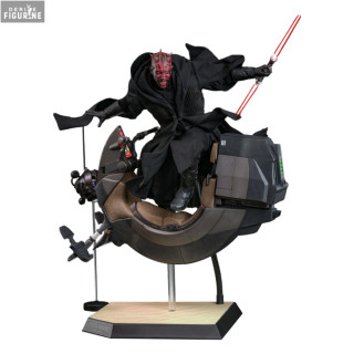 This piece is an exceptional tribute to one of the most iconic villains in the Star Wars universe. Darth Maul is depicted in a dynamic pose, mounted on his Sith Speeder, replicating one of the film's most captivating moments with incredible accuracy. The figure includes two interchangeable portraits that reflect his fierce intensity and focus during battle.