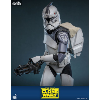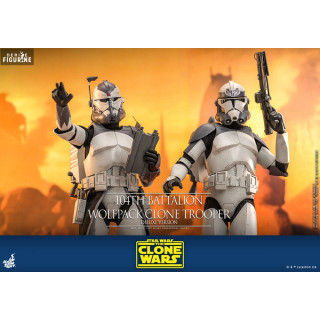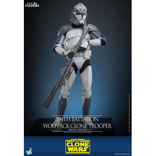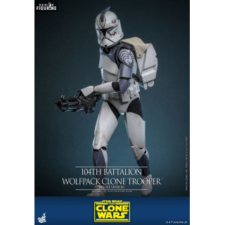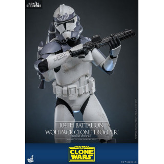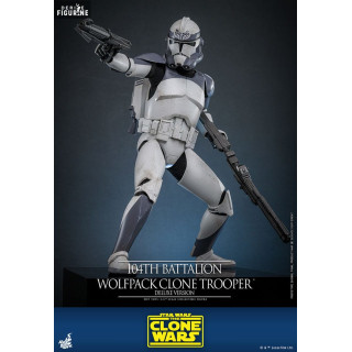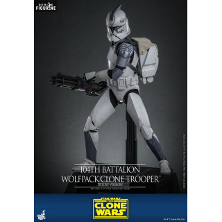 Official figure of 104th Battalion Wolfpack Clone Trooper, Deluxe which measures approximately 30 centimeters high, scale 1/6. The manufacturer is Hot Toys.