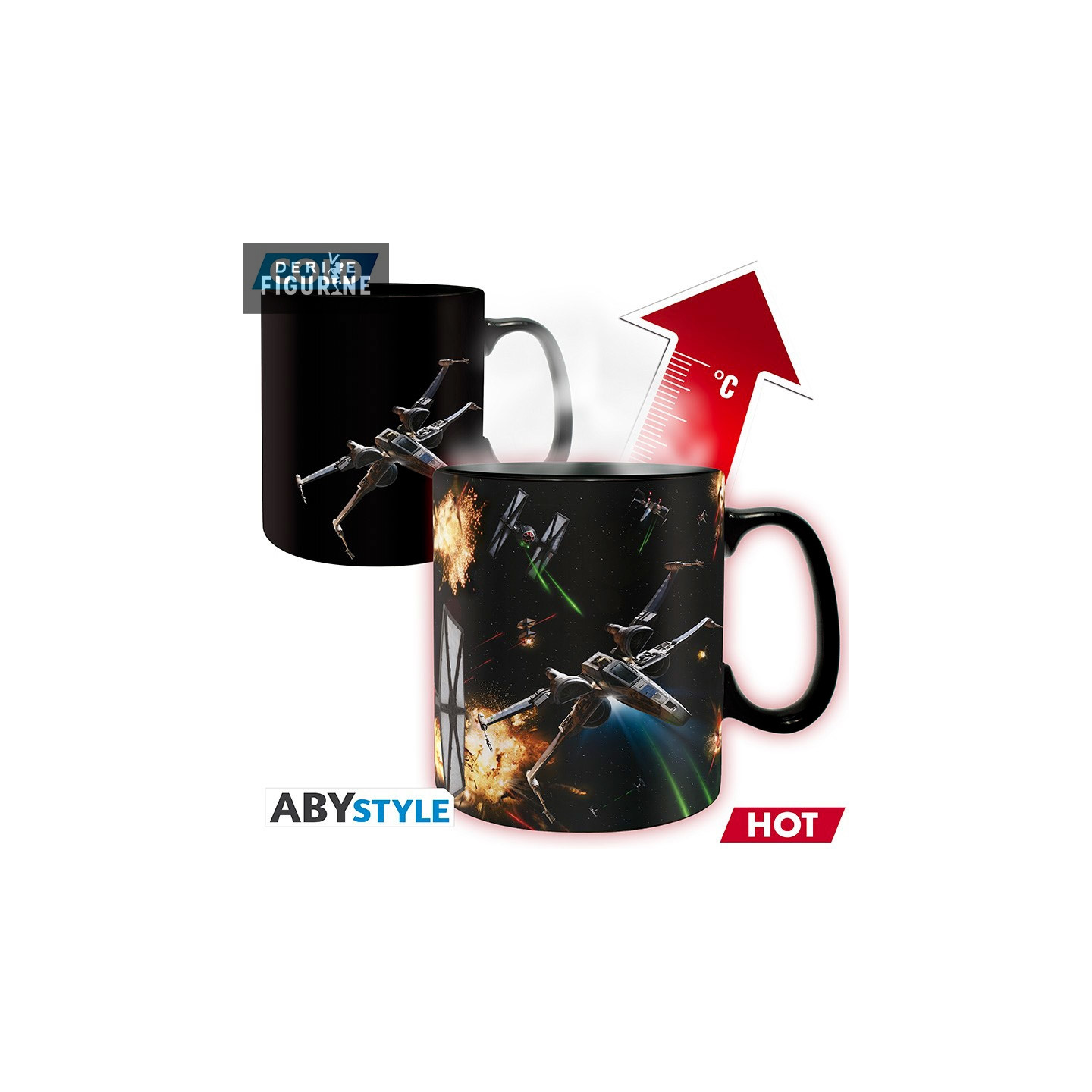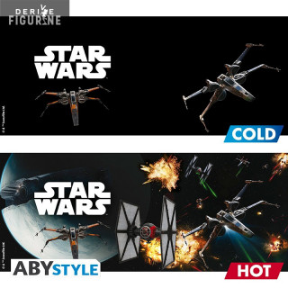 Dive into the universe of Star Wars at any time of the day, with your hot drink. An X-Wing appears on either side of the cup, after reaction to the hot liquid, a planet appears behind the first X-wing, and behind the second one can see the TIE fighter appear in full battle.