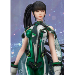 From a visual point of view, you can see her metallic green bodysuit, tightly fitted with white and dark sections that suggest armor plates and integrated tech. Her long black hair flows straight down her back in fine strands, adding a sense of motion. The translucent cape with delicate patterns frames her silhouette and reinforces the sci-fi style. Her slim, long sword is sculpted with clearly visible details on the hilt and blade, while the round base stays simple so the focus stays entirely on Eve when you display her.