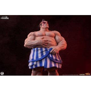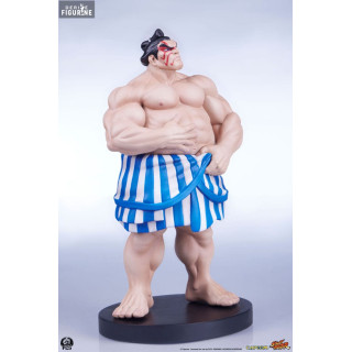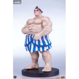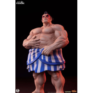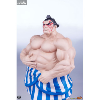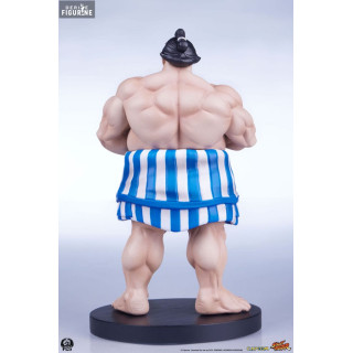 Next to her stands Edmond Honda, measuring approximately 22 x 13 x 10 cm, in an imposing stance that captures his raw strength and sumo technique. Dressed in his traditional blue and white striped mawashi, Honda shows an expression of intense focus, ready to execute his powerful moves. The muscular details of his sculpt, combined with the realistic textures of his sumo attire, bring the character to life with striking realism.