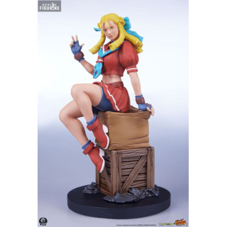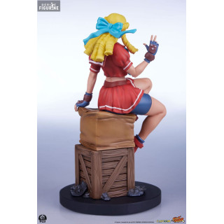 Karin Kanzuki, measuring approximately 18 x 10 x 8 cm, is beautifully sculpted to reflect her aristocratic and confident stance. Elegantly seated on a wooden crate, Karin sports her distinctive red uniform with her recognizable blonde hair tied in long braids. The details of her outfit, like the folds of her uniform and the ribbons on her wrists, showcase a high level of craftsmanship, highlighting her refined character and agile fighting style. Her relaxed yet ready-to-fight pose perfectly reflects her determined attitude and competitive spirit.