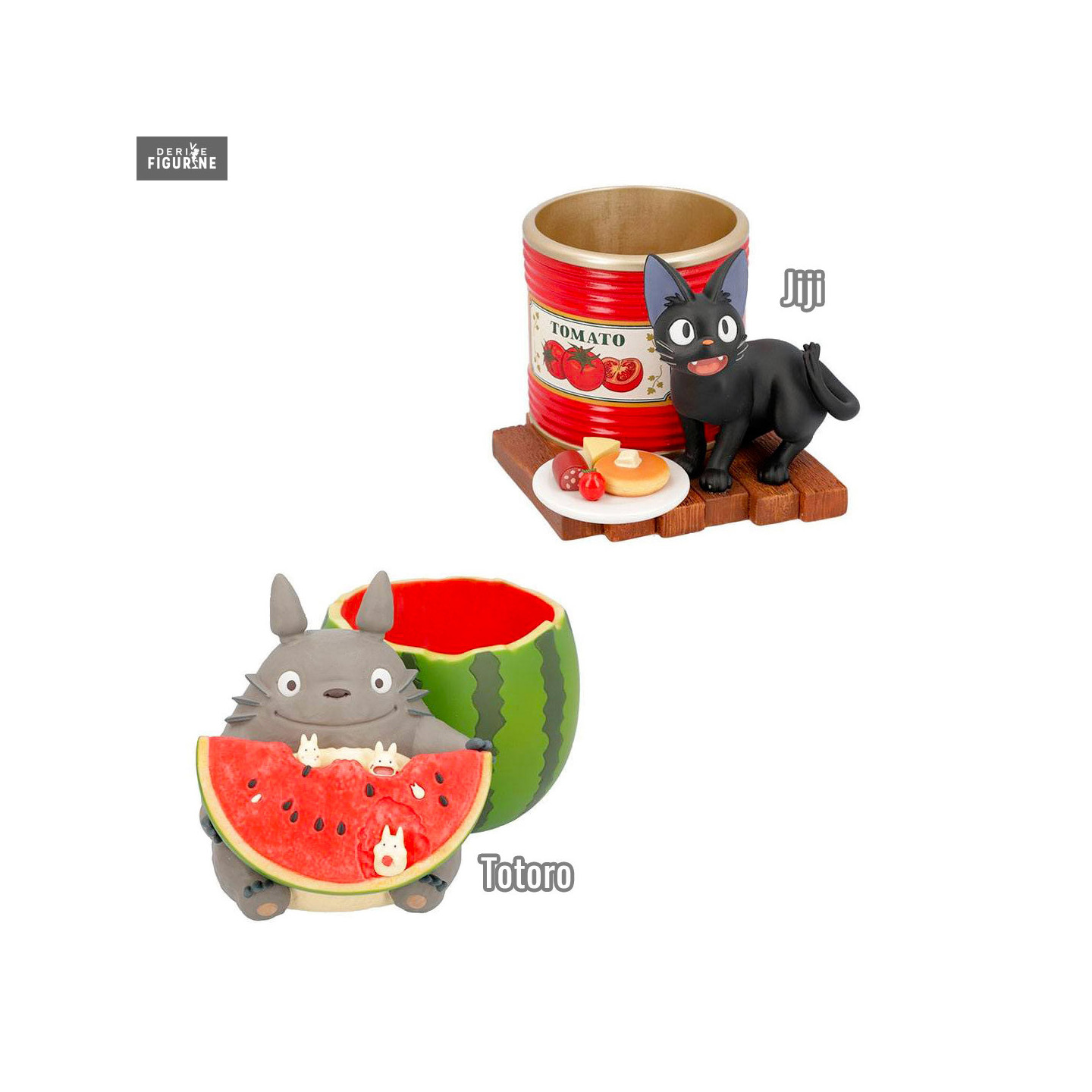 Do you want to plant a few flowers at home to brighten up your interior? This is good because we have just two small soliflores to offer you. On the one hand we have Jiji, the black cat that we find in Kiki's Delivery Service, next to a can of tomato, while on the other we have Totoro and little white Totoro from My neighbor Totoro who feast on a watermelon.