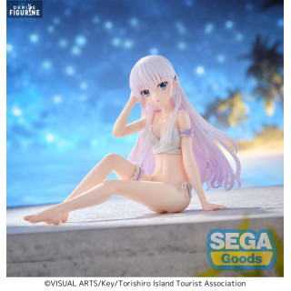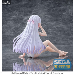 This Yumemirize figure portrays her in a pristine white bikini with mauve accents, seated on the ground, one hand gently brushing her long pastel hair. Her pensive expression, gazing toward the horizon, captures the soft melancholy intrinsic to her character. The delicate straps of her swimsuit, the light ruffles around her thighs, and the subtle hair gradient are faithfully rendered.