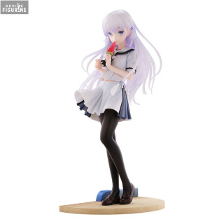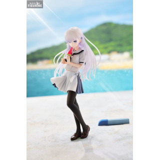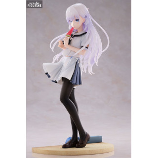 This stunning 1/7 scale figure captures Shiroha in a quintessential summer scene from Summer Pockets. Dressed in her school uniform, she stands on a sandy beach-inspired base, holding a slice of watermelon in her hands. Her gentle, dreamy expression, the soft flow of her long hair, and the subtle details of her outfit perfectly encapsulate the nostalgic and enchanting atmosphere of the game. The fine sculpting and detailed paintwork enhance every aspect, from the delicacy of her gaze to the flowing texture of her hair.