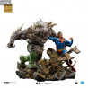 Facing him stands Doomsday, the monstrous and merciless creature who achieved the feat of killing Superman in the story "The Death of Superman". Doomsday is depicted with attention to detail, showing off his bony growths, imposing muscles and menacing gaze. The base of the figure, representing a terrain devastated by combat, adds an additional dimension to this already impressive scene.