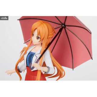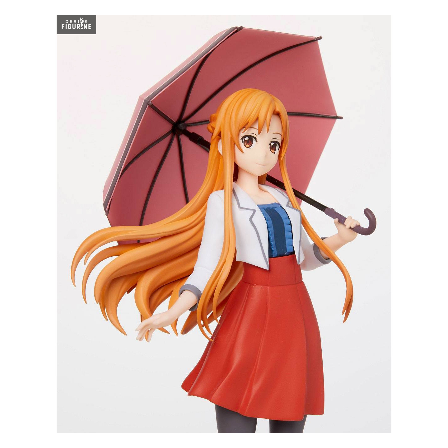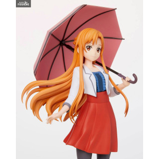 We often see Asuna Yuuki in her white suit she wears in the Swort Art Online game, but this time, she has an outfit that we could wear every day. A red skirt, a white jacket and gray tights, here is the relaxed look of Asuna. She even has an umbrella for the weather.