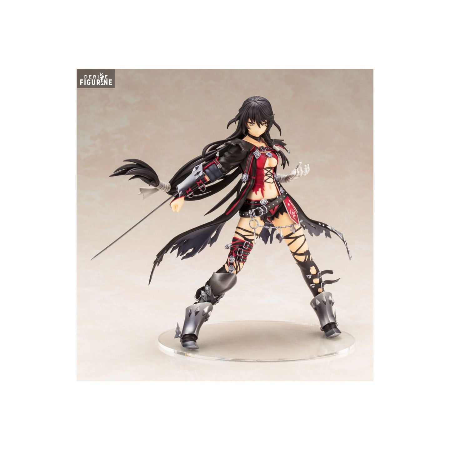 Velvet is shown mid-action—knees bent, arms wide, blade drawn in her right hand, and her cursed left arm reaching forward. Her sharp gaze, tense posture, and fierce expression speak volumes of her unyielding will. Every detail of her iconic design is faithfully reproduced: the tattered black-and-red outfit, crisscrossing leg straps, spiked belt, reinforced boots, and her flowing, shredded cape.